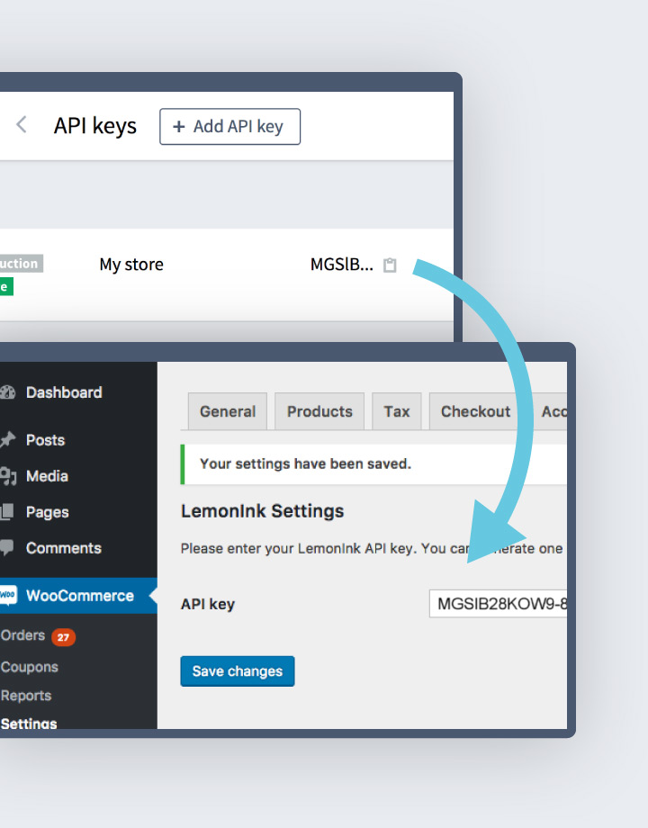 - Go to WooCommerce → Settings → Integration → LemonInk screen, paste the copied token and save.